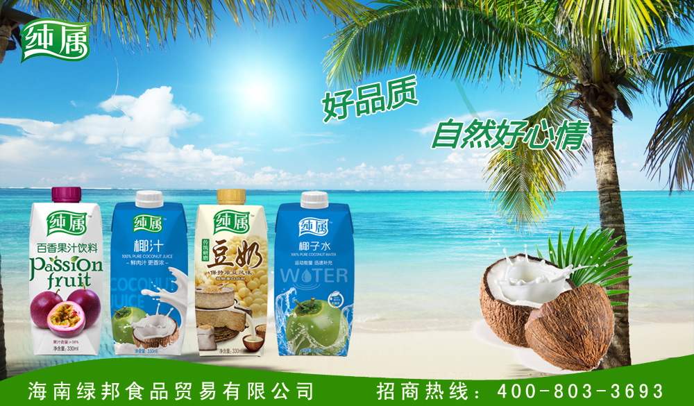 海南绿邦食品贸易有限公司是在一家以原料贸易、科研开发、生产、销售于一体的现代化食品饮料企业。公司主营产品包括有椰子汁、椰子水、百香果汁、椰浆、豆奶等饮料。