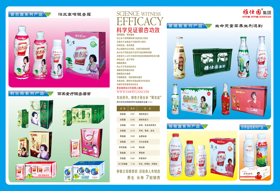 江苏“雅仕园”集团位于邳州市建设北路,系邳州市重点招商引资项目,徐州市农业龙头企业。公司成立于2006年,投资1.2个亿。主营银杏牛奶系列产品,经与江南大学技术合作,创造出银杏系列产品。公司拥有一流的乳品研发中心、乳品加工设备以及先进的乳品加工工艺,是目前国内规模较大的乳制品生产、销售企业之一。